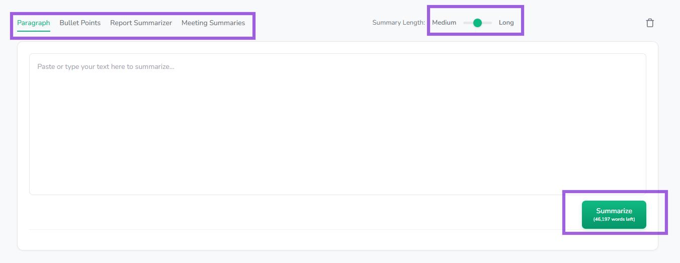 - From the left sidebar of your Quetext dashboard, click AI Summarizer.
