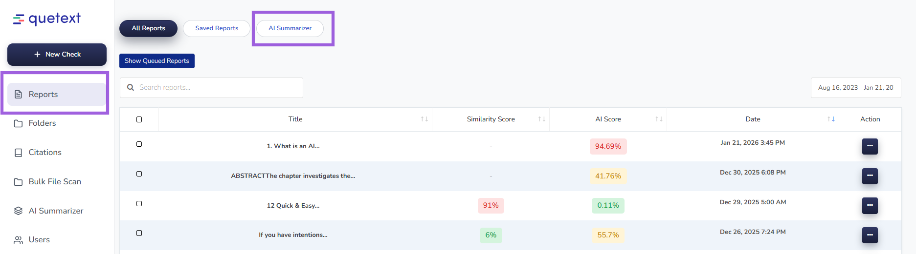 Yes, Quetext Summarizer saves your past summaries. Each summary you create is automatically stored in the Reports tab of your dashboard. You can revisit them anytime by going to the Reports tab à AI Summarizer section in your account.